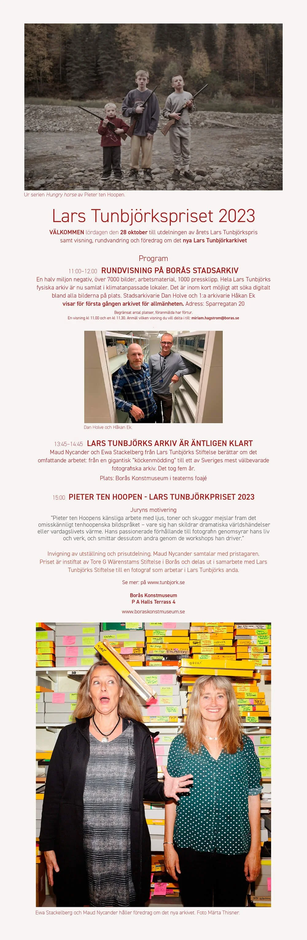 En halv miljon negativ, över 7000 bilder, arbetsmaterial, 1000 pressklipp. Hela Lars Tunbjörks fysiska arkiv är nu samlat i klimatanpassade lokaler. Det är inom kort möjligt att söka digitalt bland alla bilderna på plats. Stadsarkivarie Dan Holve och 1:a arkivarie Håkan Ek visar för första gången arkivet för allmänheten. Adress: Sparregatan 20. Begränsat antal platser, föranmälda har förtur.