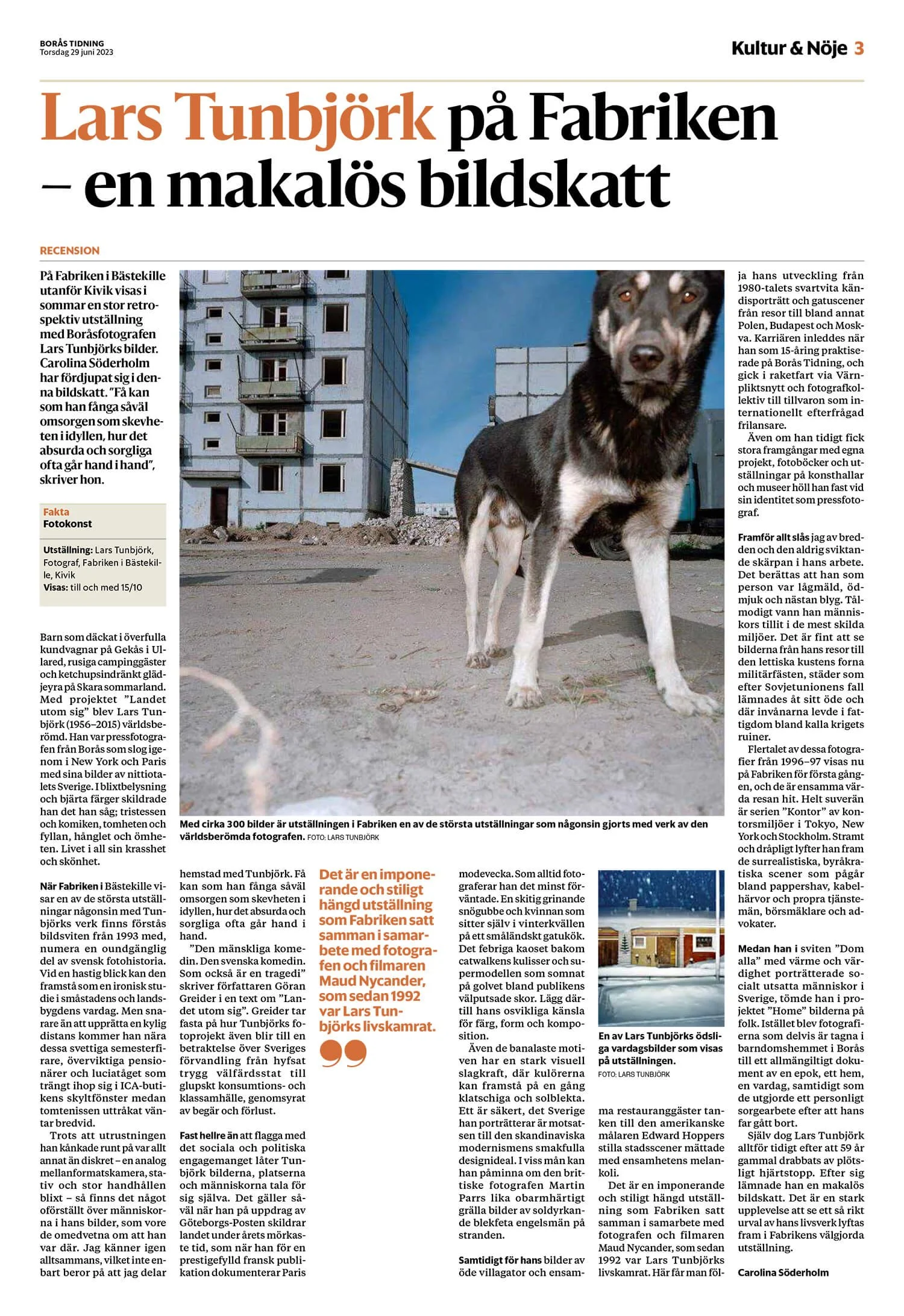 Med ca 300 bilder blir detta en av de största utställningar som någonsin gjorts med Lars Tunbjörks bilder. På utställningen visas aldrig tidigare visade bilder från vårt grannland Lettland, men även välkända projekt som Landet utom sig, Home, Kontor, Paris – fashion week samt mycket mer.
